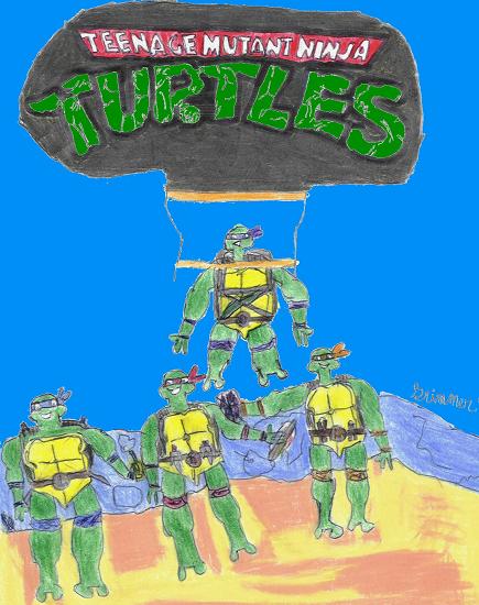 "Awesome landing, bro!" Mikey said just before the parachute fell over himself and Raphael.